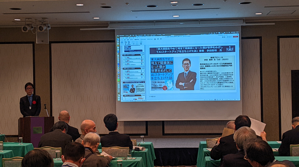 ご講演は多田様の近著に沿った内容で内視鏡検査などの第一線での診療の体験からAIによって、がんの早期発見と誤診の撲滅を目指し医療系スターアップ企業を立ち上げたご経験を中心に高度医療技術の開拓および医療関連産業の成長促進についての講演でした。